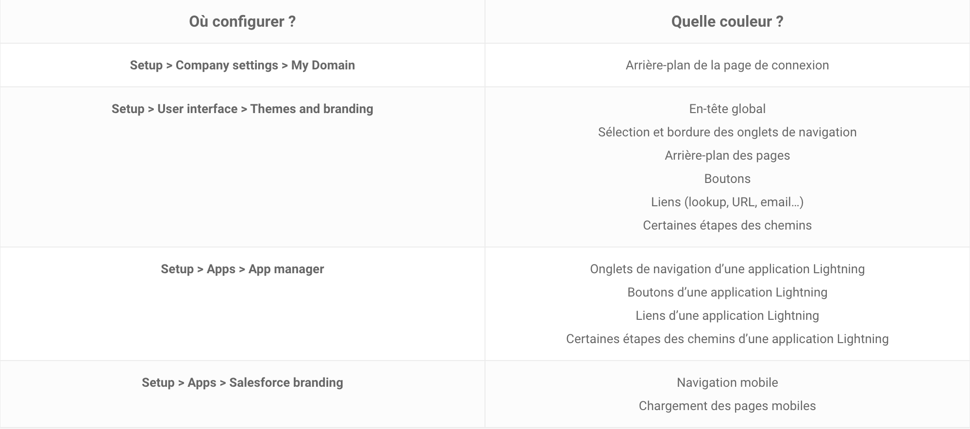 Ouvrez la fenêtre, prenez une grande bouffée d’air, et regardez le ciel : à ce moment précis, vous voyez la vie en « Bleu Lightning », mais Salesforce est parfois capable de sortir de son bleu tout puissant et vous donne la possibilité de reproduire les couleurs de votre charte graphique, sur un certain nombre d’éléments :
