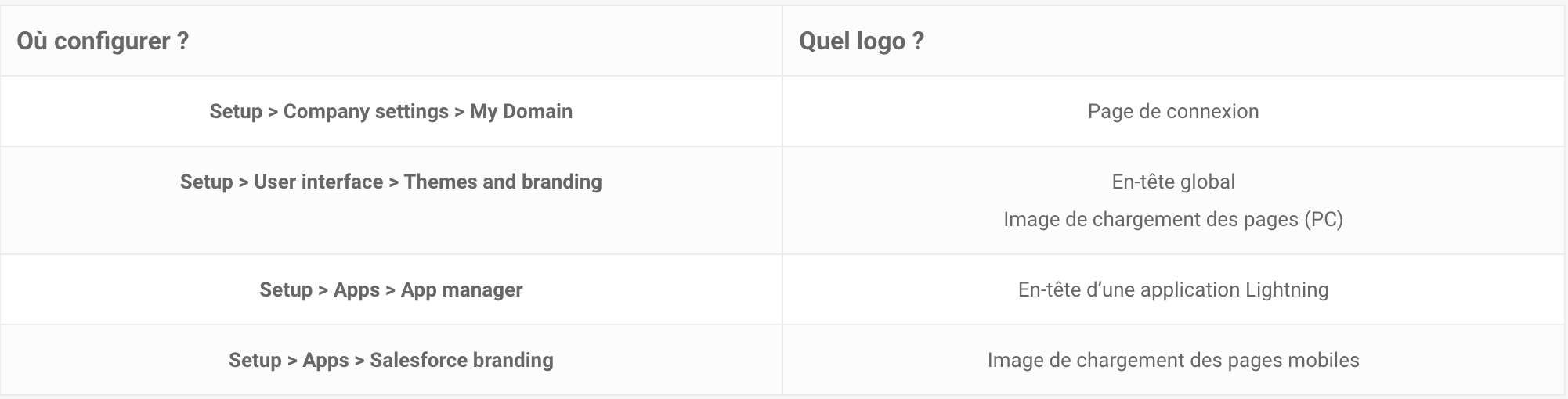 Il y a 4 utilisations possibles pour le logo dans Salesforce :