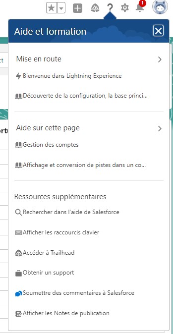 L’icône Aide en haut à droite de chaque page ouvre un menu de ressources correspondant à la page : rubriques d’aide, modules Trailhead, vidéo, et plus encore. Vous pouvez compléter les ressources recommandées avec vos propres contenus personnalisés. Si vous personnalisez le modèle, vos contenus sont affichés dans une section en haut du menu.