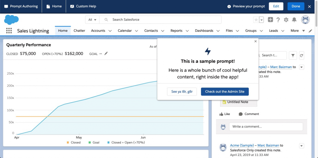 La fonctionnalité de « Guide dans l’application » offre la possibilité de créer des invites et des processus pas à pas dans le contexte d’écrans Salesforce.