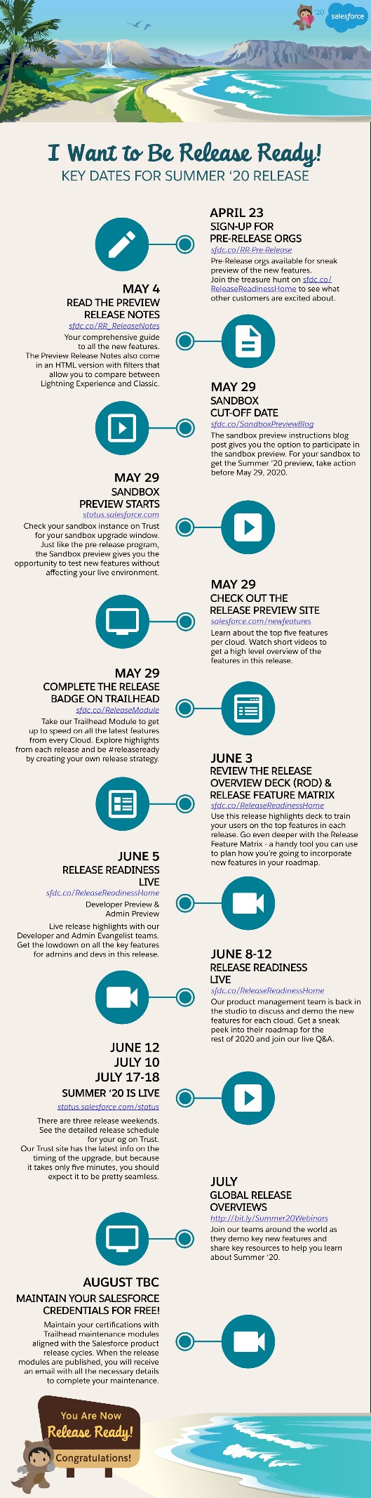 La date de release en sandbox est éminemment importante. Elle est étroitement liée à ce que l’on appelle la date de « cut-off preview ». il s’agit d’une deadline après laquelle il n’est plus possible de rafraichir une sandbox pour qu’elle soit dans la release cible. Salesforce recommande faire le refresh des sandbox bien avant ce cut-off. Exemple pour la Summer ’20 : 29 mai, à 22h (faites le refresh la veille, pour être tranquille).